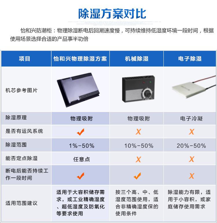 物理吸附技术就是机芯内置高效干燥剂,干燥剂吸附箱内湿气,吸湿饱和后,机芯的陶瓷加热板加热,热量传导到干燥剂,干燥剂受热后水分就向外散发,同时形状记忆合金控制阀门打开,让水分散发,平常即是关闭的。