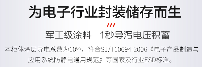 柜体涂层导电系数为10 6-9,符合SJ/T10694-2006(电子产品制造与应用系统防静电通用规范)及行业ESD标准。完整可靠的防静电防护体系,且一直可以使用,无微污染。