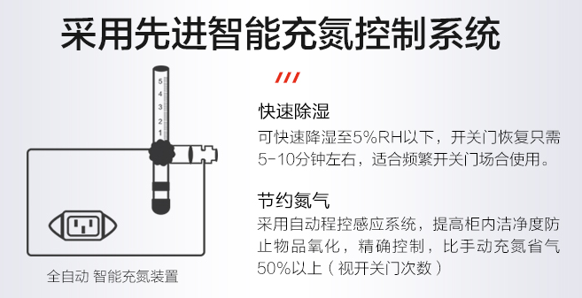 采用自动程控感应系统,根据设定湿度自动控制,当氮气柜内湿度到达设定值时,系统会自动切断氮气供应,当超过设定值时系统会智能打开氮气供应,比手动充氮省气50%以上