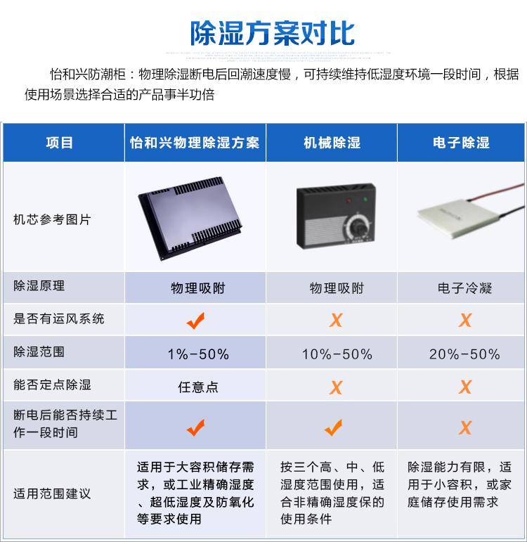 民用防潮箱与工业级防潮柜的除湿系统有很大差异。民用防潮箱多用于储存一些贵重物品,如单反镜头、邮票、古董字画、茶叶等的防潮存储,其除湿系统采用的是简易化的半导体冷凝芯片除湿技术,其制造成本低廉,所用材料,内部结构,工作原理都无法与工业级防潮箱相媲美。例如,工业级电子防潮柜采用的温湿度敏感探头是工业级的,精度,分辨率,误差与民用防潮箱的对比具有很大的差异。民用防潮箱多采用民用温湿度液晶显示仪表,市场价格百元以下,而工业级电子防潮箱的温湿度敏感探头的市场价格是千元级的,液晶显示仪表在低于20%RH湿度下无法正常分辨,误差较大,工业级的温湿度传感器探头可以精确分辨1~99%RH范围;且民用防潮箱的温湿度仪表寿命一般较短,故障率较高,温湿度年飘逸误差较大,而工业级的产品使用寿命长久,误差较小,且有严格的校准测试标准,因此,工业级防潮箱在出厂时会经过多种检测和测试,并且出厂时会附带出厂的合格的测试报告,另外,民用防潮箱除湿模块是档位调节方式,即使是数字式设定的,也是范围控制,无法做到定值控制,而工业级的电子防潮箱则是定值准确控制。
