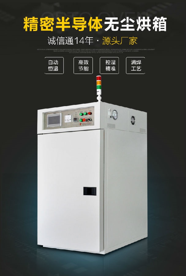 洁净烘箱具有以下特点,产品密封性要求,工作室材质用SUS304不锈钢板,内胆用氩弧焊满焊,防止空气进入烘箱内及机台本身所产生的微尘,同时节省惰性气体。外部防尘处理使用材质为SPCC钢板经过粉体喷塑,耐磨不掉尘渣。保温材质为高密度陶瓷纤维,保温节能。分层结构设计内箱层板高低可调,可自由取出,内部结构配件均采用无氧化无尘材质。干燥箱的外箱结构均采用特殊密封结构设计,确保其与洁净室的无交叉污染。箱体有活动脚轮,可任意推动和固定位置。内置的高效过滤器HEPA过滤网构造洁净室与洁净等级100以下。强制送风内循环,确保温度均匀,可选配充氮系统,可选配PLC+HMI人机触摸屏控制系统,带数据输出接口。